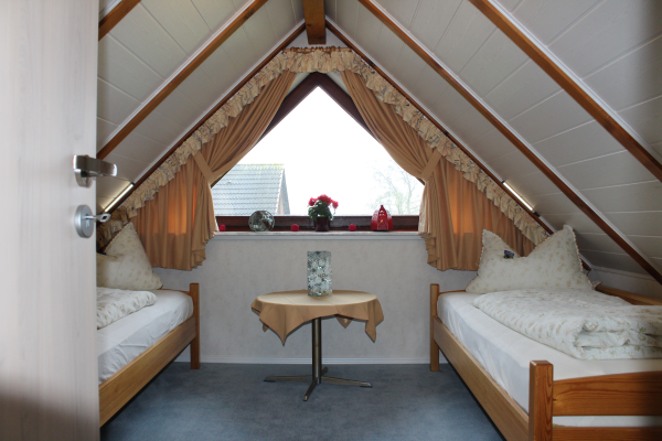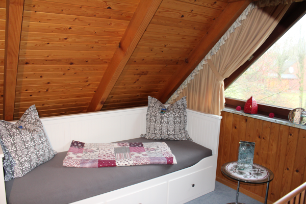 Der Schlafraum im Obergeschoss ist mit Einzelbetten ausgestattet. Zusätzlich ist hier noch ein Fernseher mit DVD-Player vorhanden. Bei Bedarf wird ein Kinderbett und ein Hochstuhl gestellt.