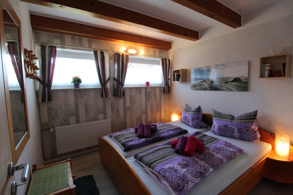 Ebenfalls im Erdgeschoß befindet sich ein Schlafzimmer mit Doppelbett (alle Betten sind bezogen) sowie das Badezimmer.