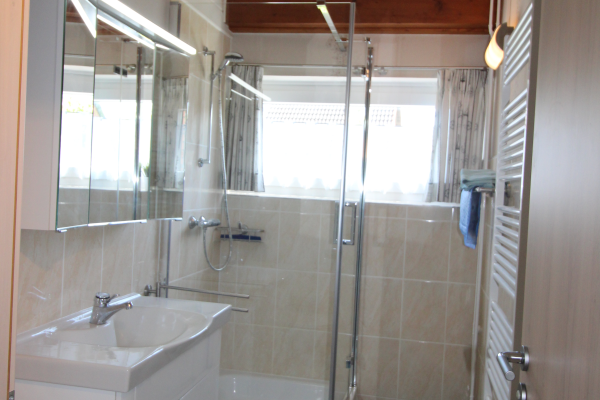 Das Duschbad verfügt über ausreichend Ablagemöglichkeiten und ist mit Föhn und Kosmetikspiegel ausgestattet.