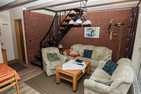 Die Wohnung geht über 2 Etagen und bietet Ihnen ein Wohnzimmer mit Zugang zur Terrasse. Hier können Sie das Urlaubswetter in Ihrem eigenen Strandkorb genießen oder sich auf einer unserer Sonnenliegen erholen.