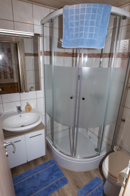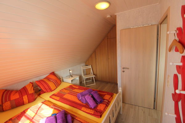 Die Schlafräume im Obergeschoss sind mit einem Doppelbett, der andere mit zwei Einzelbetten ausgestattet und die Fenster mit Außenjalousien und Fliegengittern versehen. Bei Bedarf wird ein Kinderbett und ein Hochstuhl gestellt. Ein Schlafraum ist als Durchgangszimmer eingerichtet.